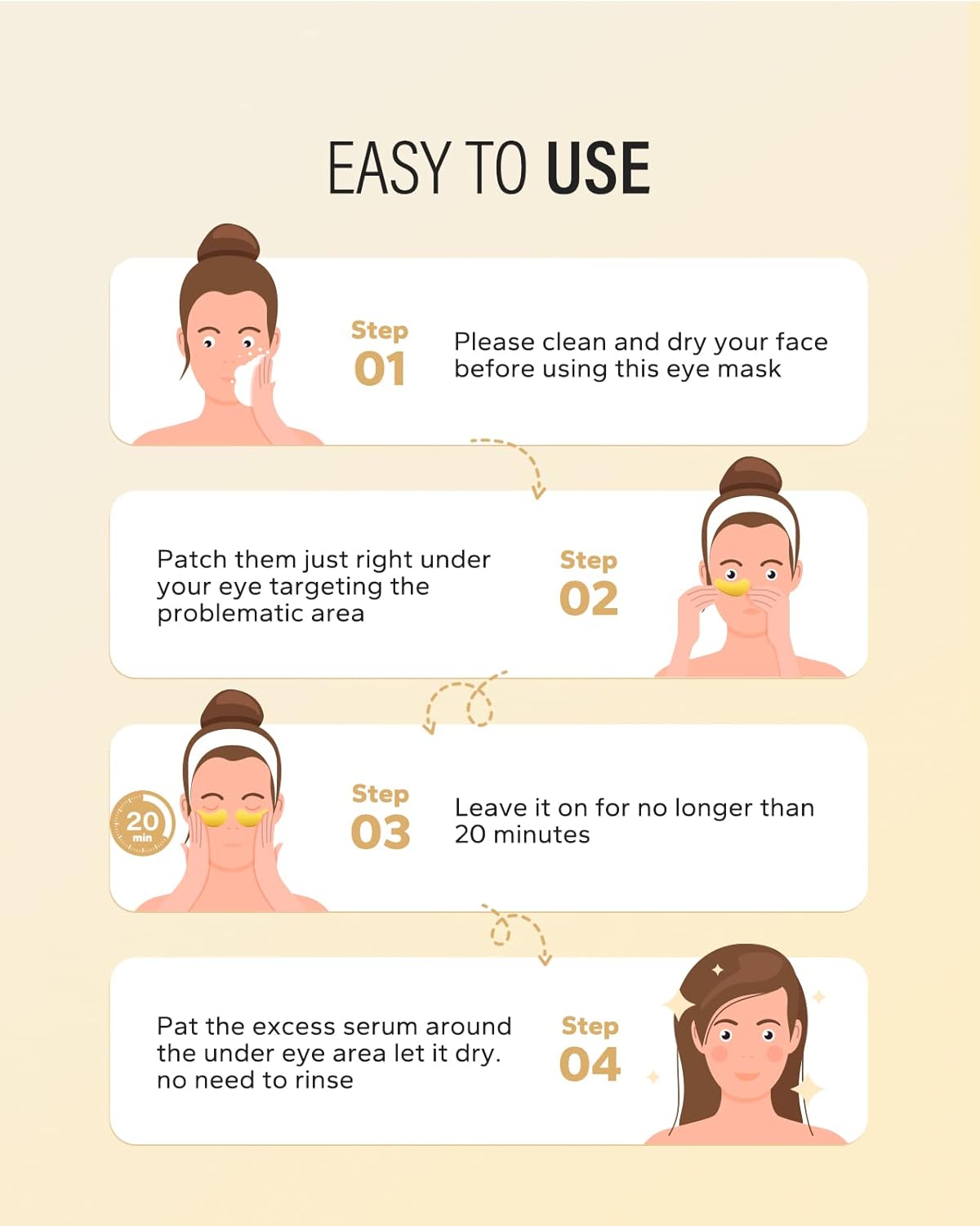 Refresh tired eyes with these gold under eye patches. Formulated with collagen, Centella Asiatica extract, hyaluronic acid, and glycerin, they help hydrate and smooth the delicate skin under the eyes. Designed to reduce the look of puffiness and dryness, these patches are easy to use and fit comfortably under the eyes. Apply for 15–20 minutes, then gently pat in the remaining serum.